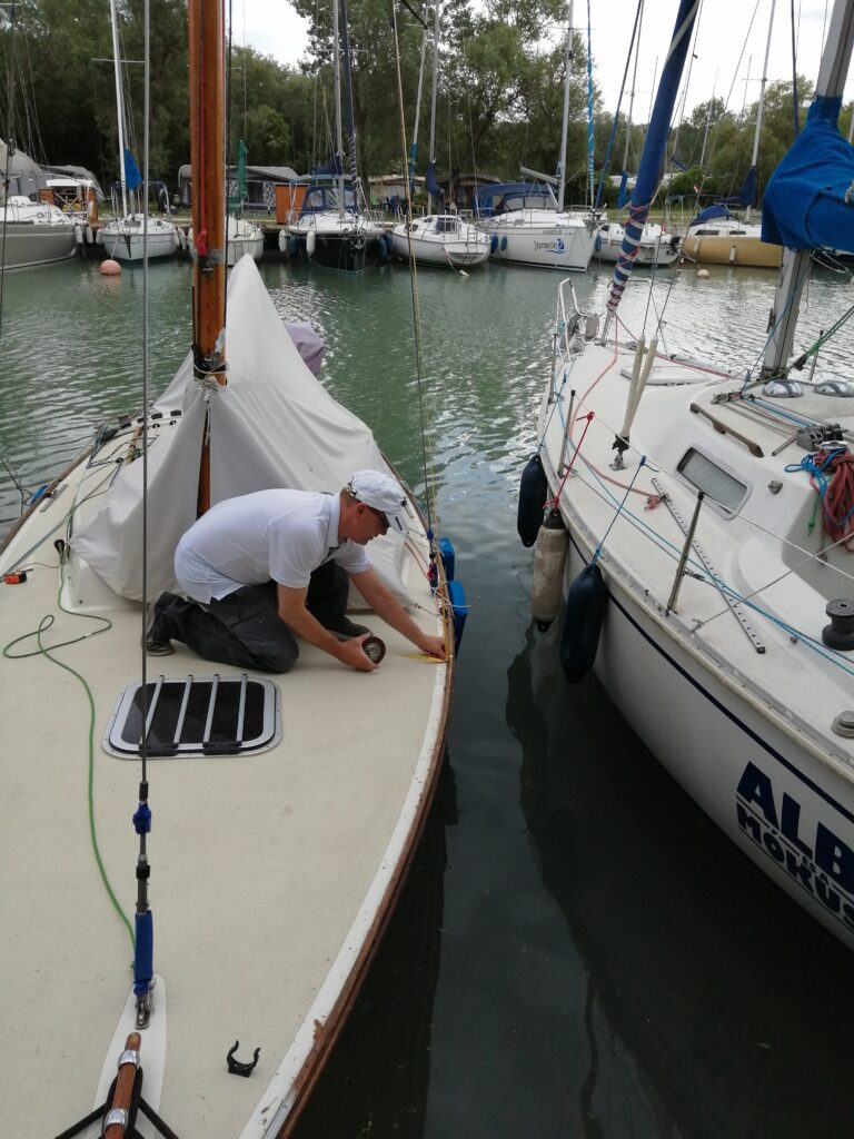 A baumot teljesen lelazítva, lefektetve helyezem el a cockpitben vagy a kajüt tetején. Ennek célja, hogy: